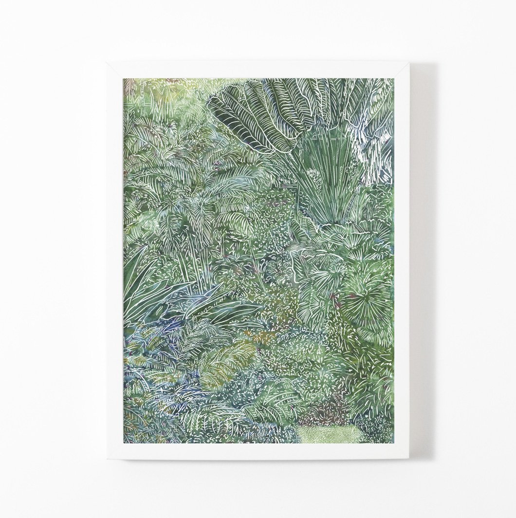 The distinctive style of the Botanical Island illustration is achieved through layering watercolour paints and incorporating intricate line details, resulting in an unconventional aesthetic reminiscent of screen prints.