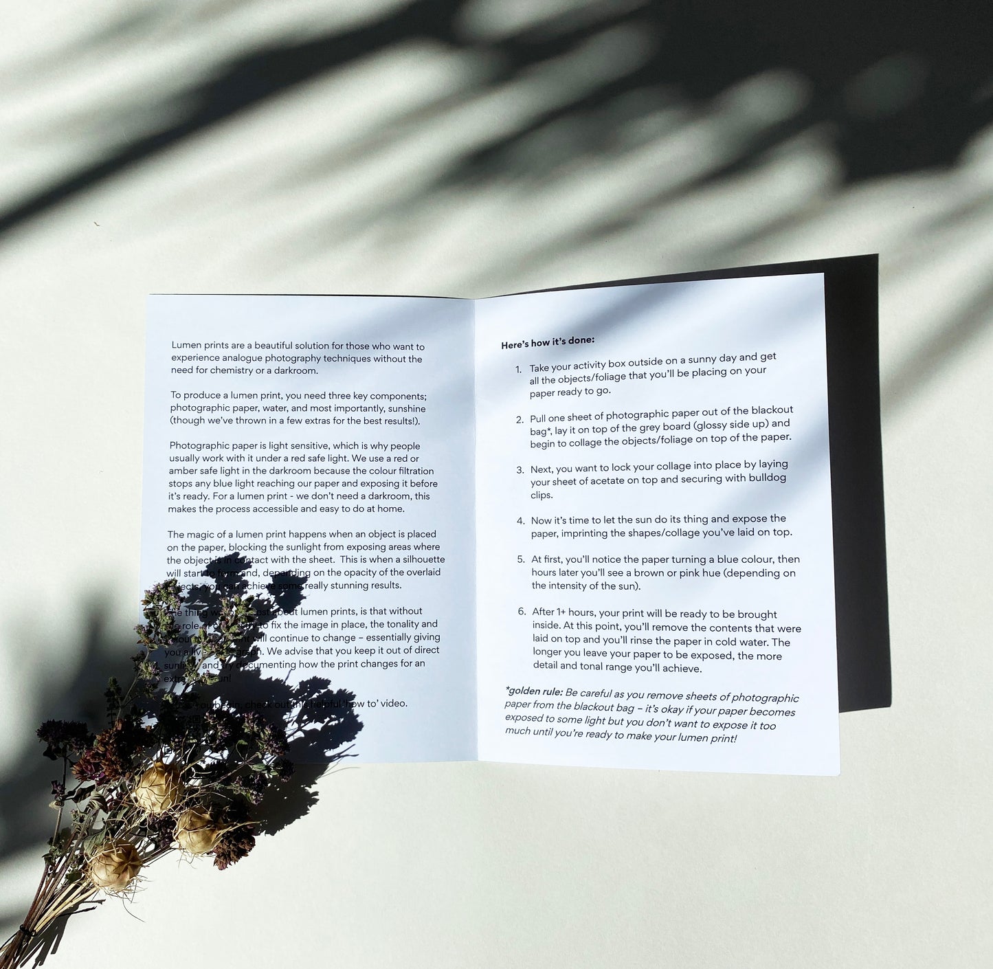 To produce a lumen print, you need three key components; photographic paper, water, and most importantly, sunshine (though we’ve thrown in a few extras for the best results!).