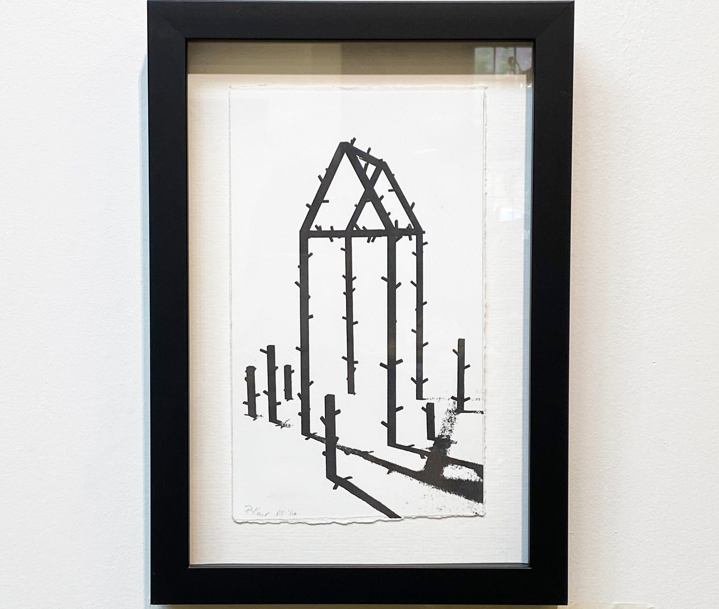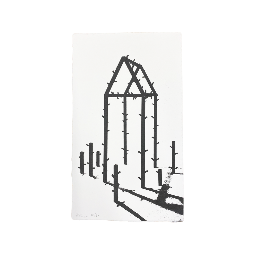 Overgrown House (2022) is the first screen printed edition created by artist Permindar Kaur. The print is based on a three-metre-tall sculpture of the same title, created in 2020. The sculpture Overgrown House is a black steel abandoned house, with growing ‘vines’ sprouting from the ground, consuming or reclaiming the structure. It is the central sculpture in her exhibition Outgrown at the Art House Wakefield, September-November 2022.