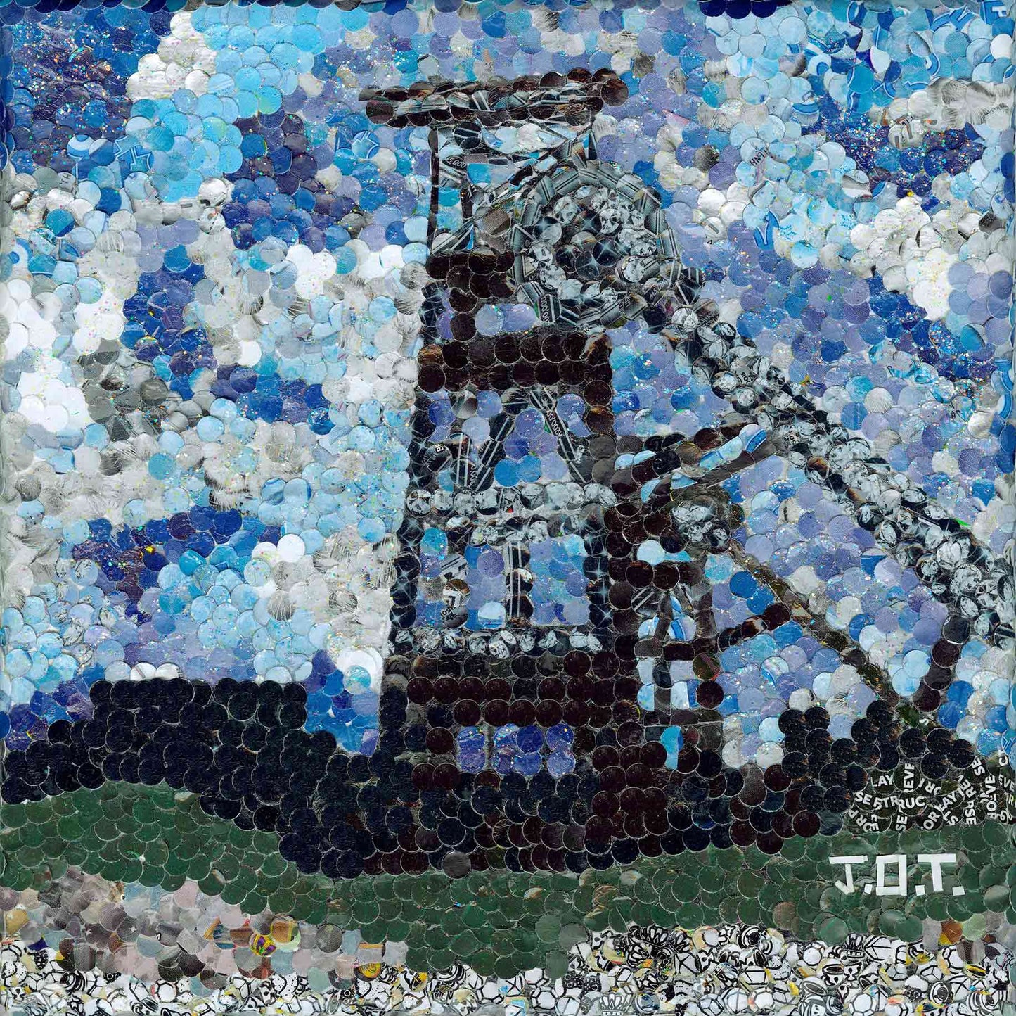 The art I create has all been made from recycled items – from the canvases I buy second-hand to the materials I use to collage onto the canvases. The sorting, tearing, cutting and hole-punching of scratch cards provides my colour palette. It could be termed Environmental Art. If what I can do will encourage and inspire people to re-use and recycle, then hopefully we can look forward to a more environmentally-friendly future.