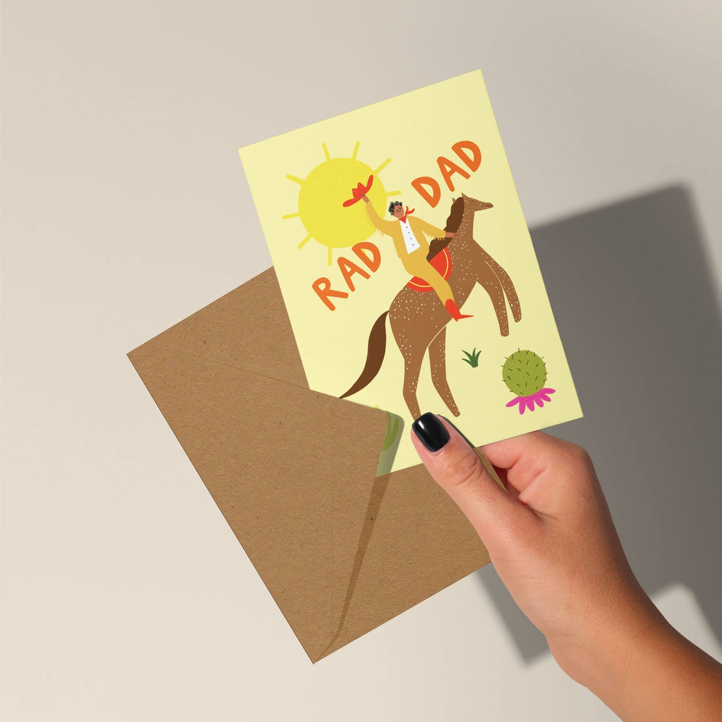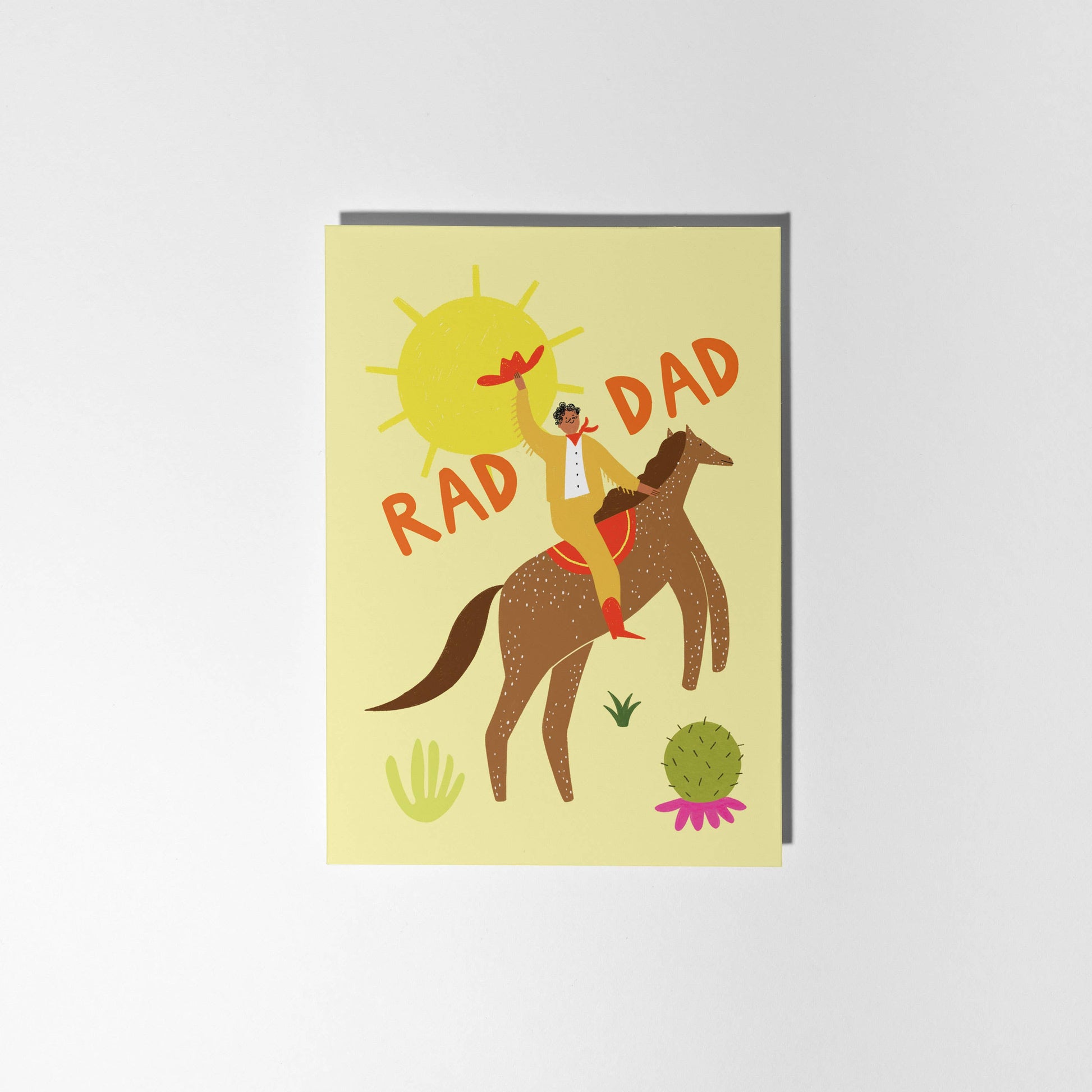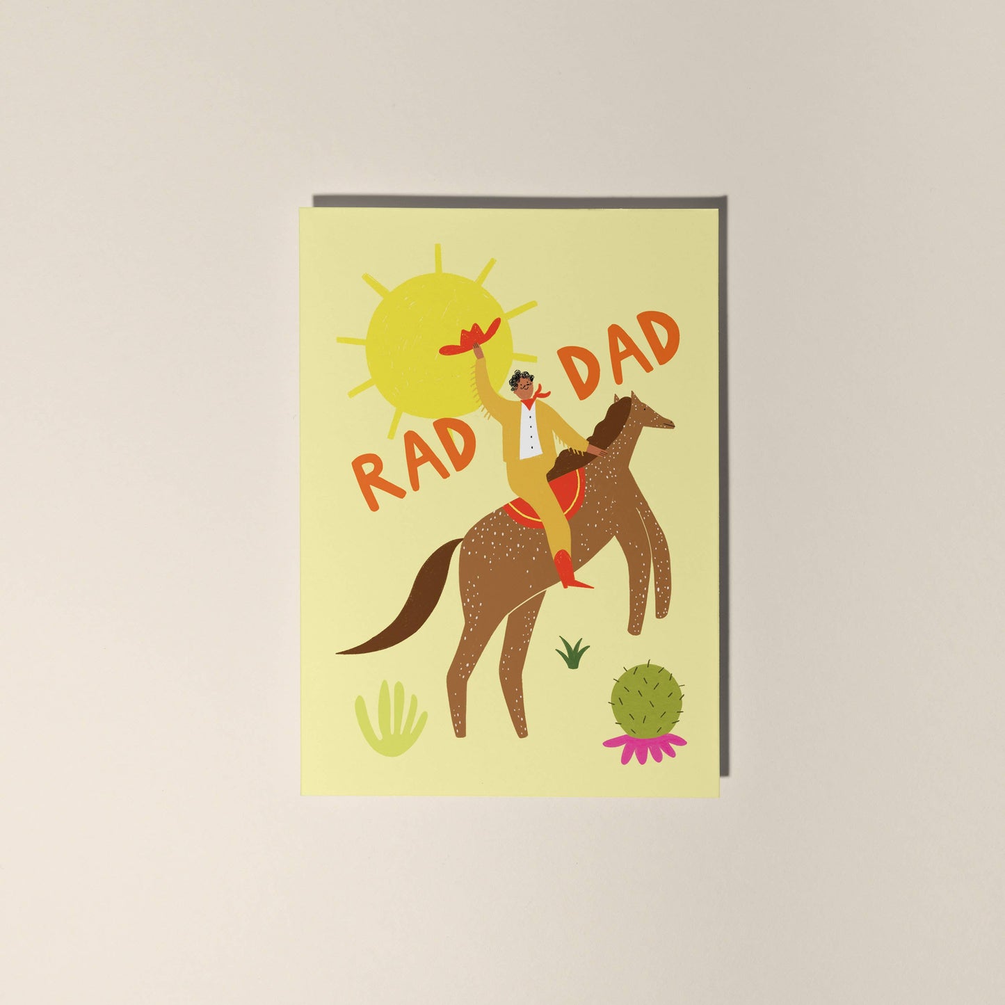 Dad card featuring a cowboy in a desert setting on a horse, surrounded by cactus and a sun with handwritten font reading 'Rad Dad'. A great option for Father's Day and a Dad's Birthday Card.