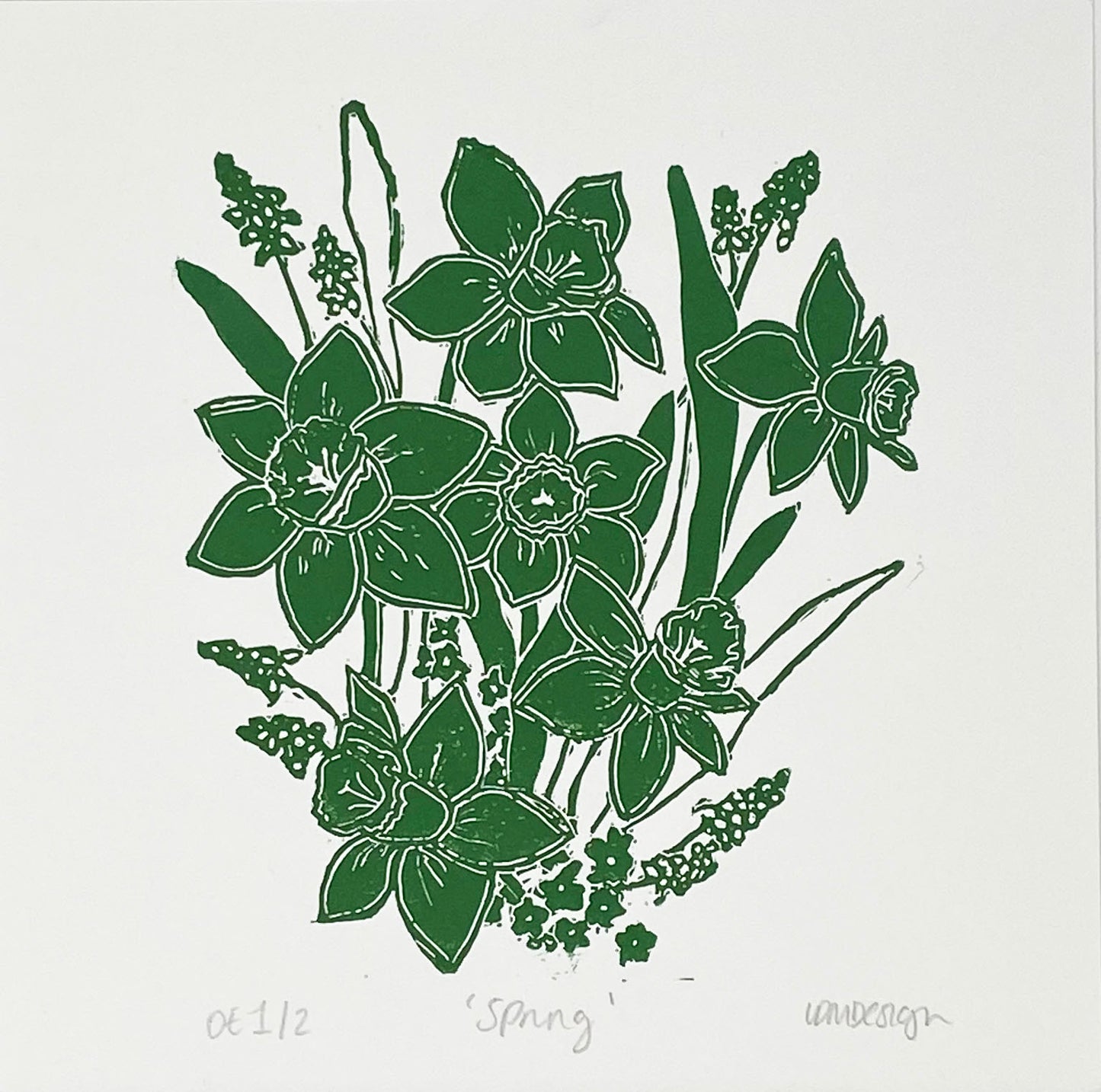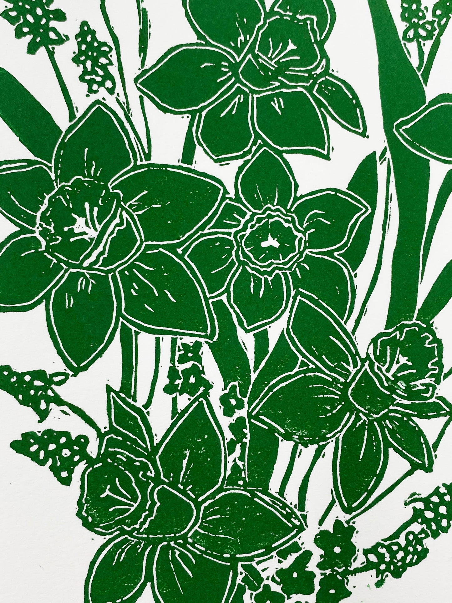 Original Lino cut print ‘Spring’ daffodils, grape hyacinth & forget me not florals.