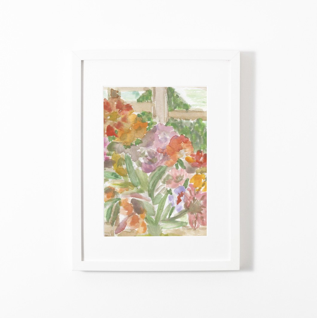 Bold strokes create a colourful abstract flower field, revealing a peaceful mountain view and a charming cottage, like a window into a serene scene. Originally painted with watercolour.